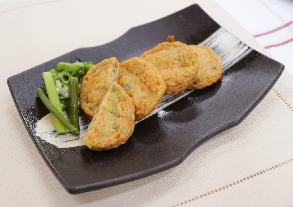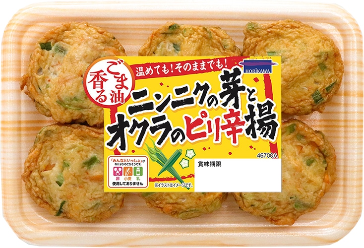 人参のシャキシャキ食感とオクラの粘り気によるふわっとした食感が特徴の野菜揚です。