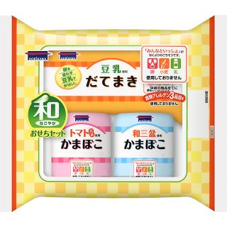 [赤蒲鉾(蒸し蒲鉾)]魚肉(アメリカ、インド)、でん粉、食塩、みりん、粉末状大豆たん白、なたね油、和三盆糖、魚介エキス/調味料(アミノ酸等)、加工デンプン、焼成Ca、トマト色素、(一部に大豆を含む) [白蒲鉾(蒸し蒲鉾)]魚肉(アメリカ、インド)、でん粉、食塩、みりん、粉末状大豆たん白、なたね油、和三盆糖、魚介エキス/調味料(アミノ酸等)、加工デンプン、焼成Ca、(一部に大豆を含む) [伊達巻(魚肉練り製品)]豆乳クリーム(国内製造)、魚肉、砂糖(和三盆糖5%)、発酵調味料、食塩、みりん、焼き油(なたね、コーン)/加工デンプン、調味料(有機酸)、乳化剤、(一部に大豆を含む)